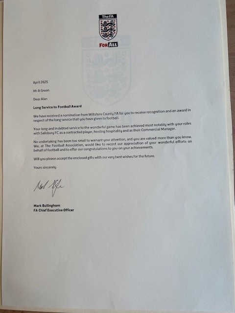 To mark 50 years in football Alan was recently a given an award and certificate from Wilts FA at the Wiltshire Premier Shield final on 29 April. Salisbury FC would like to add our congratulations to Alan on this remarkable achievement and is looking forward to many years to come of him supporting Salisbury FC in whatever capacity Alan takes on next!